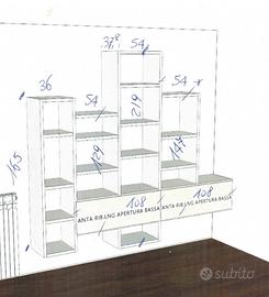 Libreria Tomasella a 4 colonne con ripiano ad ante ribaltabili, larghezza totale 2.55 mt, altezza massima 2.19 mt e profondità 38 cm. Finitura materico bianco opaco e cemento chiaro.