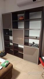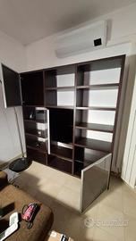 Mobile libreria a parete in legno wenge, con colonne aperte e tre moduli chiusi con ante in vetro, per esporre libri e contenere accessori. Dimensioni 187x196x40 (lxhxp).