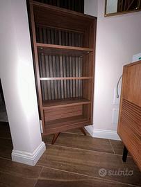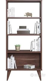 Libreria color noce sviluppata in verticale con quattro scomparti aperti. è rialzata da terra da quattro piedini. Costruita interamente in pannello truciolare melaminico. La vendo perchè sto cambiando stile del salotto.