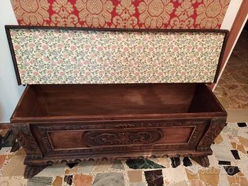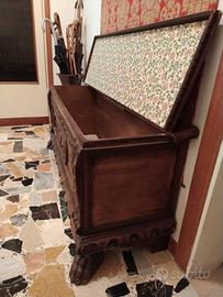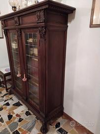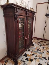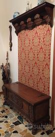 Vetrina utilizzabile anche come libreria con coordinato attaccapanni accessoriato di cassapanca divisibile, tutto legno, anni '70 in buono stato