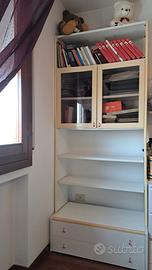 libreria con due cassetti, con vetrinetta per posare libri e mensole.