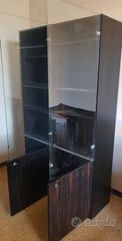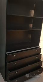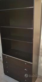 Splendida libreria/mobile giorno dal design lineare e sofisticato, perfetta per ambienti moderni o per amanti del vintage industriale. Il mobile è composto da due moduli accostabili (o un corpo unico, a seconda della struttura) che offrono un mix versatile di contenimento espositivo e chiuso. Design: Estetica razionalista con eleganti profili in metallo satinato che separano la parte inferiore da quella superiore. Materiali: Struttura in legno tonalità scura con venature a vista. Configurazione Modulo A (Cassettiera): 4 ampi cassetti con maniglie a incasso di design e vani a giorno superiori con ripiani regolabili. Configurazione Modulo B (Vetrina): Parte inferiore con ante a battente e parte superiore con eleganti ante in vetro fumé a tutta altezza. Stato: Buone condizioni generali, con normali segni del tempo che ne attestano l'originalità (piccoli graffi superficiali come da foto). Misure altezza 205 cm lunghezza 210 cm profondità 40 cm. Non viene spedita ma ritiro diretto presso sede in Fermo 63900.