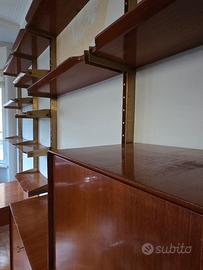 Libreria da parete anni 50 attribuita a Silvio Cavatorta interamente in teck composta da 5 montanti in legno con rastrelliera in ottone (altezza 277 cm.), 2 moduli con 4 cassetti (88×22×45) un modulo con doppia anta a battente (88×60×40) un modulo con anta a ribalta (88×40×40), 7 mensole sagomate (88×27) e 7 mensole sagomate (58×27). I reggimensola in ottone pieno si incastrano alle rastrelliere in ottone senza alcun bisogno di ulteriori fissaggi.