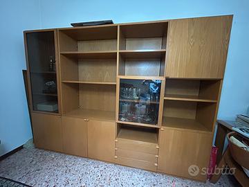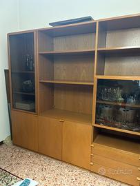 Libreria vintage in legno massello, abbinata con le sedie, mobile basso e tavolo. Altezza 1.99, larghezza 2.71, profondità 43cm