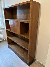 Libreria a giorno in radica modello lineare, squadrato, con 4 ripiani e sportello al a ribalta al centro, chiuso con chiave. Zoccolo di colore marrone più scuro. In buone condizioni - usato, con piccoli segni dell’età.