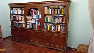 Libreria in legno vintage composta da 6 ripiani laterali piu vano centrale ad arco nella parte alta; 6 cassetti piu 6 sportelli con all interno mensole nella parte bassa. Misure: Lunghezza circa 3,3 mt Altezza circa 2,1 mt Profondità circa 40 cm.