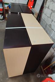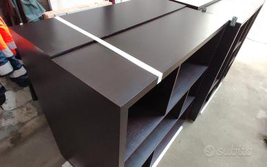 Libreria Wenge di grandi dimensioni, in legno spesso e pesante, colore marrone scuro. I moduli possono essere uniti insieme con gli appositi giunti, messi in fila o separati e divisi in varie stanze, possono anche essere ruotati per una personalizzazione più bella. Ogni modulo misura 120 x 120cm per un totale di 2.40 x 2.40m. la libreria è in condizioni eccellenti e non presenta segni o graffi, si trova al piano terra ed è comoda per il trasporto.