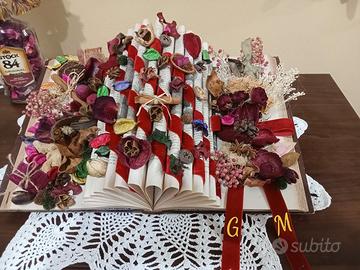 Libro antico decorato con fiori secchi e bacche naturali, nastrino in velluto rosso e iniziali personalizzate.