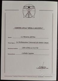 Vendo importante lotto collezionistico composto da due opere d’arte provenienti dal circuito La Memoria dell’Arte, entrambe in condizioni perfette e complete di certificato. Vendo opera multipla da collezione: “La Dichiarazione Universale dei Diritti Umani” ed il quadro “Sogno d'amore”, opera di Francesca Capitini. In imballo originale, rimasto chiuso dall'acquisto. Si tratta di un Libro d’arte monumentale di altissimo pregio, tiratura limitata a 750 esemplari numerati. Esemplare n. 513/750, come nuovo, mai aperto, completo di certificato di autenticità origunale. Opera di notevole valore artistico e culturale, realizzata con materiali e tecniche di altissima qualità, destinata a collezionisti, gallerie e appassionati di libri d’artista. Il quadro è un originale “Sogno d'Amore” di Francesca Capitini, realizzato con la tecnica di strappo d’affresco su tavola, dimensioni: 40 × 50 cm; condizioni perfette, sempre rimasto imballato, certificato di autenticità presente. Contatto privato per ulteriori foto e informazioni. Ritiro diretto gratuito in zona Milano Est (Pessano - Carugate - Cologno Monzese) Disponibile consegna a mano con trasporto con la mia auto, a prezzo da stabilire, in provincia di Milano – Monza - Bergamo Spedizione con corriere disponibile solo dopo visione ed accordi e a totale carico dell'acquirente.