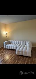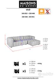 Lilo - Divano angolare destro a 4/5 posti color sabbia di Maison du Monde. Il divano come si può vedere dalla scheda tecnica è composto da due pezzi. E’ molto comodo, ha una trama molto morbida e si presenta in ottime condizioni poiché è stato sempre coperto da un telo. E’ stato comprato meno di due anni fa ed è stato trattato con molta cura.