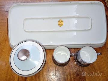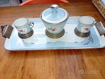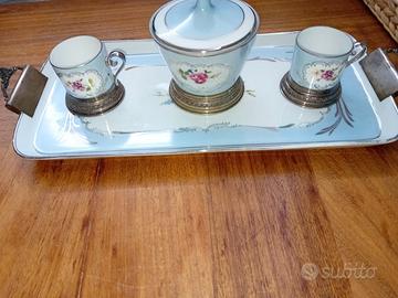 Vassoio con 2 tazze caffè e zuccheriera porcellana limoges decoro raffinato con rose, base tazzine supporto in argento 800. Profilato in argento. Usato ma in ottimo stato e ben tenuto, conservato.