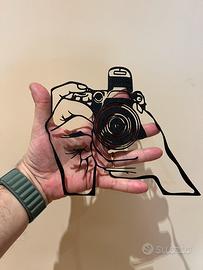 Line art moderna raffigurante una macchina fotografica reflex, realizzata con stampa 3D in PLA nero.