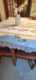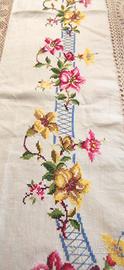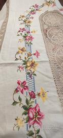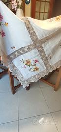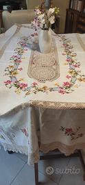 Meravigliosa Tovaglia per 12 lino e uncinetto con ricamo a punto croce. 12 tovaglioli compresi. Color écru con ricami a fiori colorati. Misure lunghezza 270 Misure larghezza 160. Questa tovaglia è un pezzo unico interamente lavorato a mano per questo motivo il prezzo è poco trattabile.