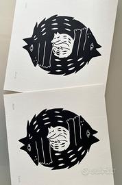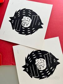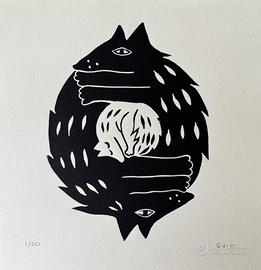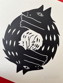 Linoleografia originale stampata a mano, parte di una serie limitata di 20 esemplari numerati e firmati. Disponibili più copie. Dimensioni: circa 21 x 21 cm Titolo: Nesty, not Nasty Un’immagine ispirata all’idea che la cura e l’accoglienza debbano avere la meglio sulla ferocia, in un equilibrio di opposti che richiama lo yin e yang. Ogni stampa è realizzata artigianalmente e presenta le naturali variazioni del processo manuale, che rendono unico ciascun esemplare. Perfetta per chi ama le stampe artigianali in serie limitata, ma anche come regalo fuori dagli schemi per una nascita o un baby shower. Cornice non inclusa. Prezzo: 20 € per singola stampa