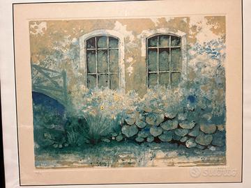 Litografia "Giardino" di Giuseppe Giorgi. Splendida serigrafia/litografia materica originale dell'artista italiano Giuseppe Giorgi. L'opera raffigura un pittoresco giardino lussureggiante con finestre ad arco e un ponte, in vivaci tonalità di verde e teal. Si tratta di un'edizione limitata, numerata a mano 100/100 e firmata dall'artista. Include la cornice nera e il passepartout come mostrato in foto. Ideale per collezionisti o amanti dell'arte contemporanea italiana. Misure 83,50 x 71 (cornice inclusa), 69 x 56,50 (foglio di stampa escluso passe partout), 59 x 46 immagine con sotto firma e n. copia