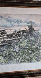 bella litografia 50x70 a firma di Renzo Vespignani ,anni 85 ,degrado della societa ,sfascio con bambini e sfondo con gazometro ,bellissima cornice inclusa .