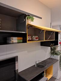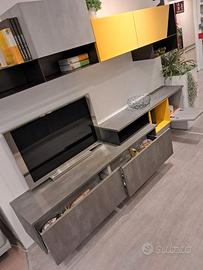 Living Scavolini in laminato decorativo effetto cemento con pensili metallo e laccato opaco Giallo MISURE: cm 270 x 36/45 prodotto nuovo con sconto extra da Expo ( Escluso Trasporto e Montaggio )