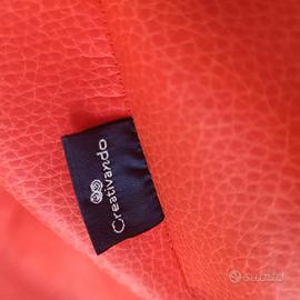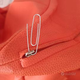 In Ecopelle, chiusura a cerniera volutamente senza cursore per evitare che rovini il pavimento, per chiuderla usare graffetta removibile come in foto.