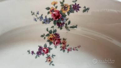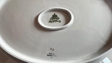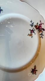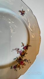 Servizio di piatti in porcellana color avorio con delicate roselline di differenti colori di Bohemia Royal Ivory, così composto: 8 piattini dolce/antipasto da 20cm di cui uno reincollato ma in modo sicuro ( l ho sempre lavato in lavastoviglie senza problemi ) 11 piatti fondi da 24cm 11 piatti piani da 25cm di cui uno con due microlesioni 2 vassoi da 38x26 cm e 34x24 cm Presenti impercettibili difetti della porcellana evidenziati in foto Preferisco il ritiro a mano ma, se è necessaria la spedizione, contattatemi per dividere l annuncio e poter fare due pacchi per maggiore sicurezza a vantaggio di tutti. È presente anche un Lotto 2 con 10 piatti piani aggiuntivi