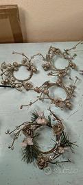 -4 Mini Coroncine/Anelli decorativi con pino, bacche e fiocchi argento/oro pallido.
