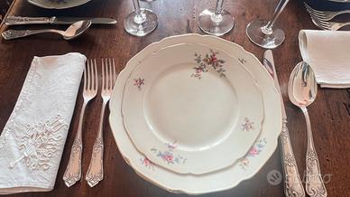 10 piatti piani in porcellana avorio con delicate roselline di diversi colori, diametro 24cm. Abbinabili al Lotto 1 che contiene il resto del servizio.