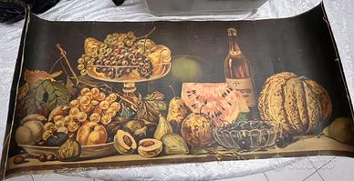 Secondo quadro (frutta e vino): una natura morta più classica, con un’abbondanza di frutta matura – uva, pere, fichi, pesche, anguria e melone – disposta accanto a una bottiglia di vino. I colori intensi e dorati sottolineano la ricchezza e la pienezza della composizione, evocando abbondanza e convivialità.