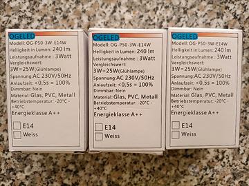 vendo per errato acquisto lotto di 3 lampadine a led marca Ogeled Germania), con 240 lumen di potenza, equivalente a 25 W (consumo 5 W) con filetto piccolo E14, classe energetica A++