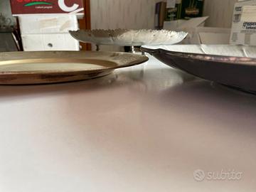 Vendo splendido lotto di 3 piatti/vassoi vintage in metalli misti, perfetti per una mise en place eclettica, per allestimenti vetrine o come basi per centrotavola.