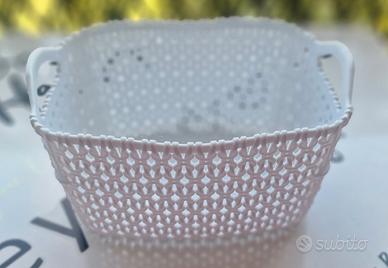 2 cestini portaoggetti: uno bianco e uno nero, perfetti per riporre shampoo, bagnoschiuma o altri piccoli oggetti.