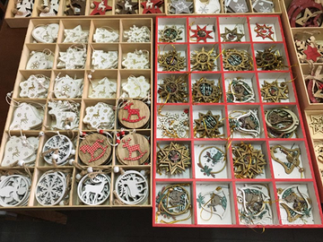 Vendo lotto di 524 pezzi di addobbi misti in legno per alberi di natale. Laserati e decorati interamente a mano. Il prezzo di vendita in negozio sarebbe pari a 1100,00 euro, vendo a prezzo forfettario di realizzo.