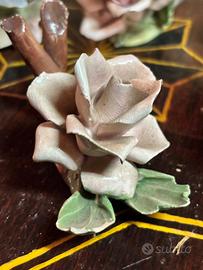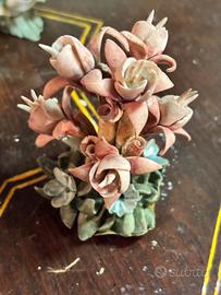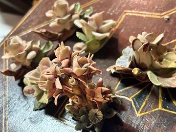 Elegante lotto di 6 bomboniere in porcellana italiana, con raffinati motivi floreali in stile Capodimonte. Il lotto comprende sei pezzi decorativi con rose e composizioni floreali realizzate con grande cura nei dettagli, in delicate tonalità pastello. Ogni elemento presenta caratteristiche proprie per forma, finitura e composizione, Alcuni pezzi riportano marchi o etichette differenti sul fondo, tra cui riferimenti a Capodimonte, Made in Italy e una etichetta di rivenditore di Napoli. Si consiglia di osservare attentamente le foto per dettagli, marchi e differenze tra i singoli pezzi. Condizioni Oggetti vintage/usati in buone condizioni generall. Possibili lievi segni del tempo, polvere, piccole imperfezioni o normali irregolarità di lavorazione, compatibili con la delicatezza della porcellana e con l'età degli oggetti. Venduti come da foto e visti e piaciuti.
