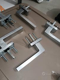 Vendo set di maniglie acquistate presso Leroy Merlin, causa inutilizzo/cambio progetto. Finitura cromo satinato, design moderno squadrato. Il lotto comprende: 6 per finestre: complete di perno e viti, adatte per apertura classica e a ribalta. 1 Set per porta blindata: coordinato, incluso limitatore d'apertura (gancio di sicurezza) maniglia, mostrina interna foro chiave e occhiello.