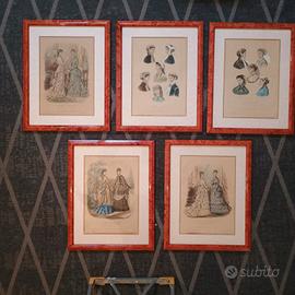 Stampe di moda litografiche antiche francesi incorniciate di Anais Toudouze "La Mode Illustree" Set di 6 compreso di cornice in legno massello con rivestimento effetto radica.