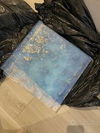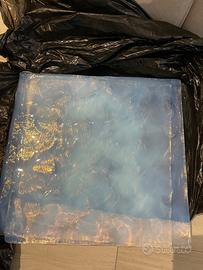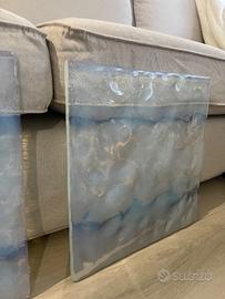 Vendo pregiato lotto di 8 lastre in autentico Vetro di Murano, originali anni '60/'70, in condizioni museali. Questi pezzi sono ideali per progetti di interior design di alto livello: creazione di pareti retroilluminate, pannelli decorativi, piani per tavoli o come ricambi rari per grandi installazioni luminose d'epoca (stile Barovier, Mazzega, Venini). La superficie presenta la tipica texture "martellata" della colata artigianale muranese, che crea riflessi spettacolari una volta illuminata. • Dimensioni: 38 cm x 38 cm (cadauna). • Lavorazione: Vetro colato con inclusione di foglia d'oro 24kt e sfumature azzurro minerale. Superficie artistica "martellata". • Stato: Perfette, integre, senza alcun segno di usura o sbeccature. • Quantità: 8 pezzi identici. Ideali per arredamento d'interni di lusso, restauro di grandi lampadari d'epoca o creazione di elementi retroilluminati di design.