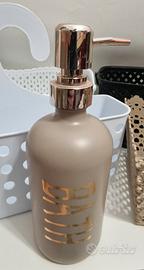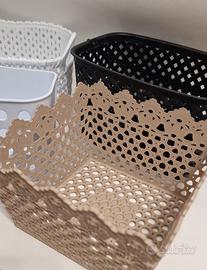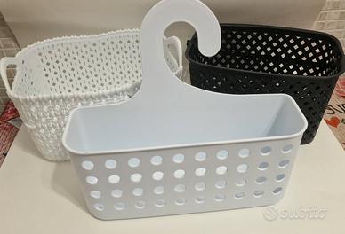 Vendo set di 5 pezzi per l'organizzazione del bagno, usati ma in buone condizioni generali. Ideali per tenere in ordine cosmetici, flaconi e piccoli oggetti. Il lotto include: 1 Dispenser sapone: in ceramica/resina color tortora con scritta "BATH" dorata. 1 Cesto pensile bianco: con gancio, perfetto per la doccia o aste porta-asciugamani. 1 Cestino beige traforato: stile pizzo/uncinetto, molto decorativo. 2 Cestini intrecciati: uno bianco e uno nero, con manici laterali.