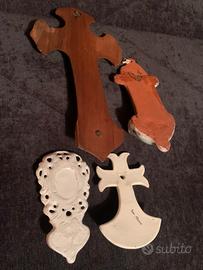 Lotto di quattro acquasantiere religiose, in ceramica e legno e bronzo, alcune antiche con crocifisso, un paio sono state riparate come si vede nell'ultima foto