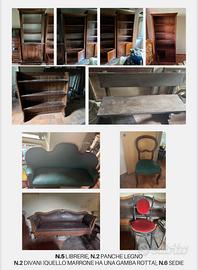 Il lotto comprende: - 4 armadia a due ante - 1 vetrina ad angolo alta - 1 vetrina libreria - 2 cassettiere - 5 librerie - 2 panche - 2 divani - 6 sedie Condizioni come da foto. Ritiro ad Acquasanta Terme. 2000€ tutto