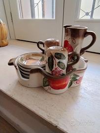 Lotto ceramiche anni 80 con decorazioni floreali vintage. Olio, aceto, sale, pepe + 4 piattini in ciotola con manici, sagomata, che li contiene. Piatto da portata, diametro 30. Ciotola. Ritiro a Palermo zona via Roma.