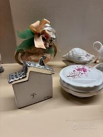 Vendesi splendido lotto di ceramiche vintage, ideale per collezionisti o per arredamento in stile classico/retrò. Il lotto comprende pezzi di diversa manifattura, tra cui spiccano eccellenze dell'artigianato italiano. Il lotto include: • Rara scatola porta-gioie a forma di casetta con tetto argentato, firmata dal Maestro Armando Rotondo (Scuola di Capodimonte). Un pezzo d'arte di grande fascino (presenta una piccola sbeccatura sul bordo interno, non visibile con tetto inserito). • Vasetto in porcellana "corallina" lavorata a mano con decorazioni floreali a rilievo (marchio Capodimonte). • Elegante porta-gioie rotondo con decorazione floreale rosa e profili in oro zecchino. • Set di statuine decorative: inclusi due bambini in stile "Hummel" finemente dipinti e una simpatica mucca/cremiera in ceramica bianca. • Conchiglia porta-oggetti decorata e vasetto ornamentale con confezione originale/fiocco. Condizioni: Gli oggetti sono in buone condizioni generali, salvo piccoli segni del tempo che ne testimoniano l'autenticità vintage.