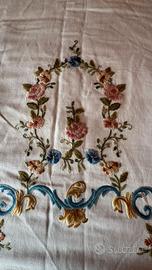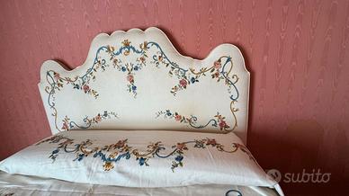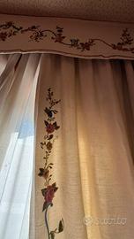 Elegante Completo letto matrimoniale con testiera in tessuto lino imbottita, sagomata e ricamata a mano con motivo rose, copriletto e tendaggi abbinati