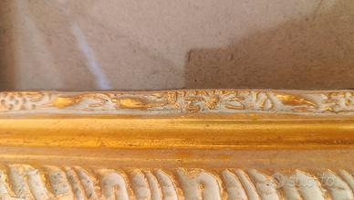 5 cornici in legno dipinte a mano, color oro. Presenti solo 3 vetri. Cornici un po' vissute ma che possono ancora fare la loro figura. Prezzo inteso per l'intero lotto.