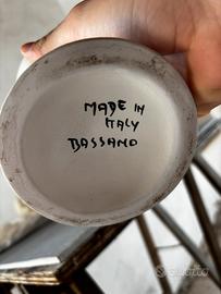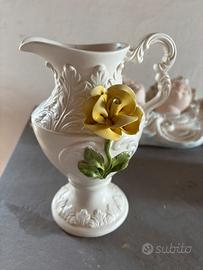•Brocca Bassano (Made in Italy) in ceramica bianca decorata a rilievo con fiore giallo applicato a mano