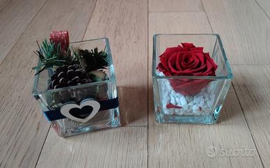In regalo due vasetti decorativi, uno con rosa stabilizzata, l'altro con pigna e rametti di pino
