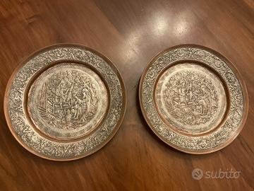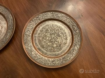 5 pregiati piatti decorativi in rame incisi a mano ,di provenienza presumibilmente medio orientale della metà del xx secolo VISIONABILE E RITIRABILE a San Doná di Piave (Non si spedisce)