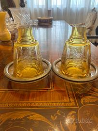 Due splendidi vasi o bicchieri decorativi in vetro ambrato, con incisione floreale a rilievo e sottopiatti in metallo argentato.