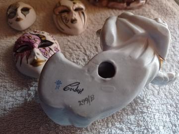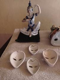 1) Danzatrice Thailandese (Khon) con copricapo a punta (Chada) in porcellana fine lucida, dipinta con motivi floreali sul vestito e finiture dorate in oro zecchino sul copricapo e sui gioielli ************** 2) Centrotavola decorato con fiori in rilievo in ceramica smaltata traforata (Manifattura di Capodimonte) *N coronata* ************** 3) Fanciullo / Putto con grappoli d'uva in ceramica "biscuit" (non smaltata) (Manifattura di Capodimonte) *N coronata* ************** 4) Coppia galante in stile Rococò in abiti settecenteschi in ceramica smaltata lucida (Manifattura di Capodimonte) *P coronata* ************* 5) Set di quattro (4) maschere decorative in stile veneziano in miniatura dipinte a mano con motivi stilizzati e dettagli dorati in ceramica ******************************* 6) Angelo disteso che legge un libro , caraterizzato da decorazioni bianche e decorazioni in oro sui bordi della veste e delle ali in ceramica smaltata bianca (Manifattura di Capodimonte) *N coronata* *Firmata CORTESE (Guido Cortese) Collezione Numerata : 299 / b ******************************* *Avvolgimento specifico in PLUREBALL* *Servizio di Spedizione Tutto Subito