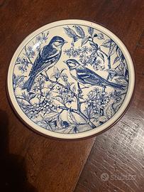 I piatti raffigurano splendidi uccellini (tra cui il Ciuffolotto e il Fringuello) con decori in stile classico blu e bordeaux.