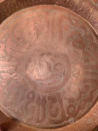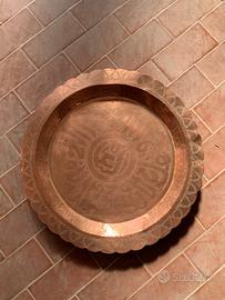 1 piatto è in rame, finemente cesellato con scrittura araba. Diametro 40 centimetri.