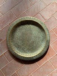 1 piatto è in ottone, finemente cesellato in decori arabi. Diametro 30 centimetri.
