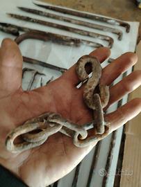 Splendida collezione di ferramenta rurale autentica, forgiata interamente a mano. Il lotto include oltre 20 pezzi unici: chiodi da carpenteria con testa a fiore, perni a L fino a 40 cm, una robusta catena con gancio a S e staffe strutturali. Ogni elemento presenta una magnifica patina originale "da ritrovamento", ideale per progetti di industrial design, restauro di casali o creazione di complementi d'arredo vintage (appendiabiti, lampade, staffe). Metallo solido e strutturalmente integro. Un pezzo di storia contadina pronto a diventare un dettaglio di stile unico. Pezzi: 30 Materiale: Ferro forgiato Stato: Originale d'epoca
